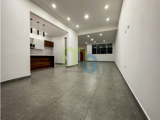 Sala, comedor y cocina todo en un solo salón, muebles de cocina construidos en melamina y sobres de cuarzo, se incluye microondas con extractor, plantilla y horno empotrado, amplia isla al frente del mueble de cocina